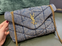 LOULOU PUFFER 牛仔布纹大号绗缝包,极致牛仔水洗工艺,手感柔软舒适,犹如怀抱云朵般的感受;经典的Y家logo、链条及扣眼五金均采宗古铜金色五金,包袋开口处折叠后使用了磁性四合扣封口,密闭性及安全性一流;包内设有一个拉链内袋可放置手机及贵重物品,除此之外无多余内袋设计,使用起来随心所欲!